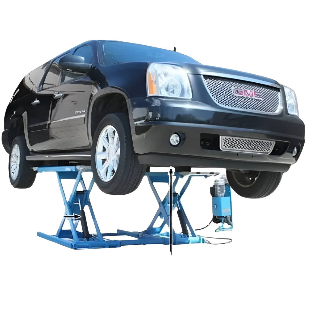 Built for durability and ease of use, the Kwik-Bay features dual hydraulic cylinders, solid safety lock bars, grease zerk fittings at all hinge points, and drive-over ramps for smooth vehicle positioning. This portable scissor lift is ideal for tire and brake service, inspection, or any application where a reliable, versatile mid-rise lift is needed.