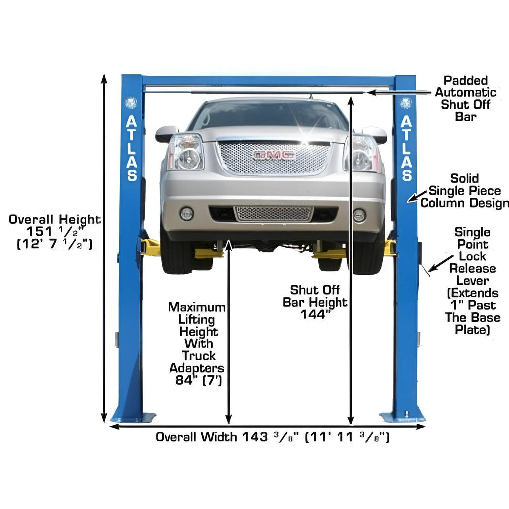The Atlas OHX10000X features a single-piece 12' 7" formed column and an extended carriage, providing exceptional column and arm strength to securely lift and support up to 10,000 lbs. Its longer cylinders allow vehicles to be lifted 3 inches higher than many other comparable models, making it ideal for taller operators or those needing extra clearance. This commercial-grade lift requires a minimum ceiling height of 13 feet for proper installation, making it a robust and reliable choice for heavy-duty vehicle maintenance.