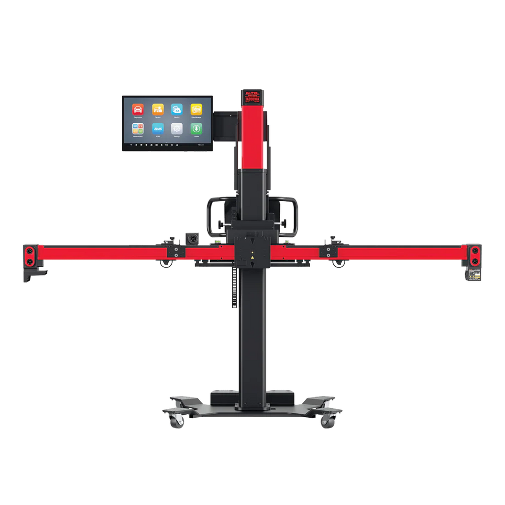MaxiSYS ADAS IA900WA with LDW targets package includes the MaxiSYS IA900WA Wheel Alignment and ADAS calibration frame that enables the performance of four-wheel alignment and ADAS component calibration and includes Lane Departure Warning targets and boards for ADAS camera calibrations. Software includes illustrated alignment instructions, live readings, required tools, and adjustment locations display on included 24” touchscreen screen. Alignment coverage for U.S., Asian and European vehicles. Six high-resolution positioning and tracking cameras in frame automatically monitor vehicle height on shop lift. Robotic frame movement for efficient use and alignment reading accuracy to 0.02 degrees for precise alignments. Includes four wheel clamps with camera targets, steering wheel lock and wheel chocks. One-year limited warranty.