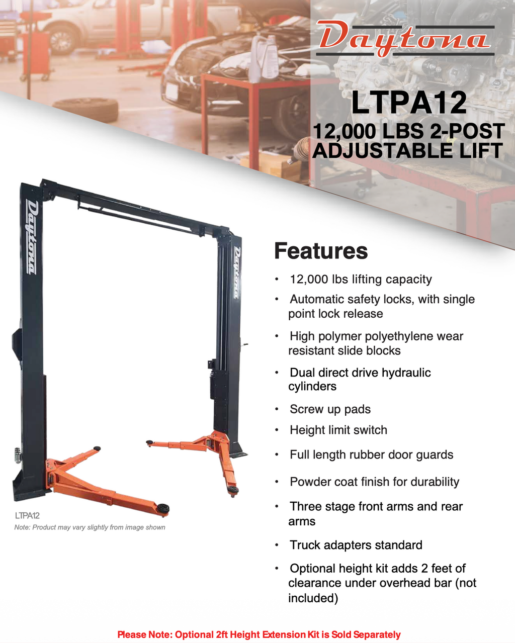 The Daytona LTPA12 Two-Post Lift brings serious muscle with smart flexibility built right in. With a powerful 12,000-lb capacity, adjustable width, and automatic safety locks, this lift adapts to different vehicles while keeping every raise rock-solid and secure. The open two-post design gives you tons of room to work underneath, and the rugged steel construction with smooth hydraulics makes lifting feel effortless. Strong, flexible, and safety-focused, the LTPA12 is built to handle heavy jobs with confidence—and make them feel easy.