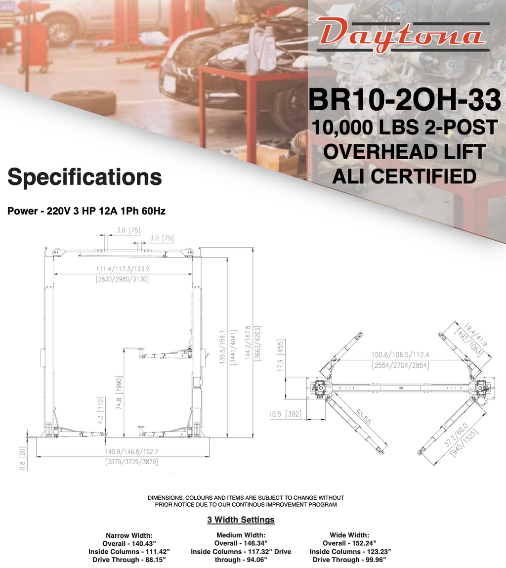 Built for convenience and durability, the BR10-20H-33 comes equipped with automatic safety locks, single-point lock release, and automatic arm restraints to ensure secure lifting with minimal user input. The matte powder coat finish offers a sleek look and enhanced resistance against shop wear and corrosion. Height extension adapters (1.5", 3", and 6") are included, and the lift is compatible with an optional 2-foot height extension kit for taller ceiling installations. With ALI certification and a 1-year warranty, this lift is ideal for serious shops looking for reliability and peace of mind.