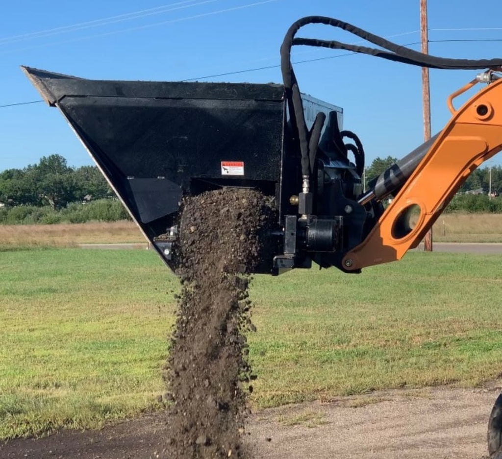 This Dual Side Flow Bucket from Top Dog Attachments lets the material be scooped up and moved out through two side discharge openings. The operator can convert this attachment into a bucket by rotating and lowering the attachment. This allows for scooping the material up; it rotates and raises to become a spreader/feeder. The side flow bucket has three orbit motors, one to run the beater bar, which helps prevent material bridging, and two from operating the flexible track that sends the material out the right or left side opening.