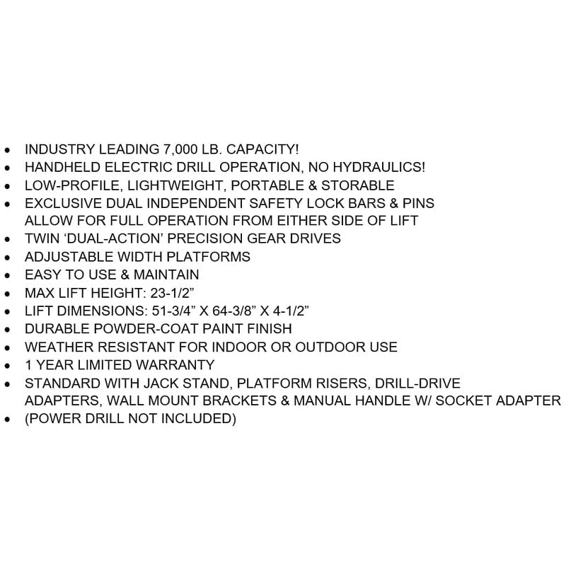Why keep wrestling with gravity when you can have this 51-3/4" long titan in your corner? With its twin 'dual-action' precision gear drives and weather-resistant finish, the 7000TLX is tougher than a drill sergeant at boot camp. Toss in the included jack stand, drill-drive adapters, and a 1-year warranty, and you've got a lifting tool that'll make your garage the pride - or envy - of the neighborhood.