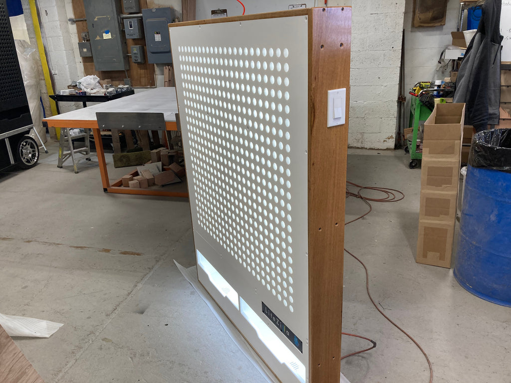 - Materials: Frame & Grid: Custom Stained Hardwood; Inner Frame Construction: Plywood; Lighting: Custom US-made LED curtains with acrylic diffuser.