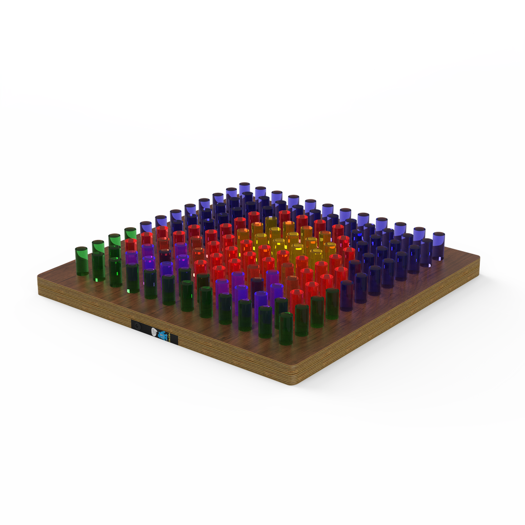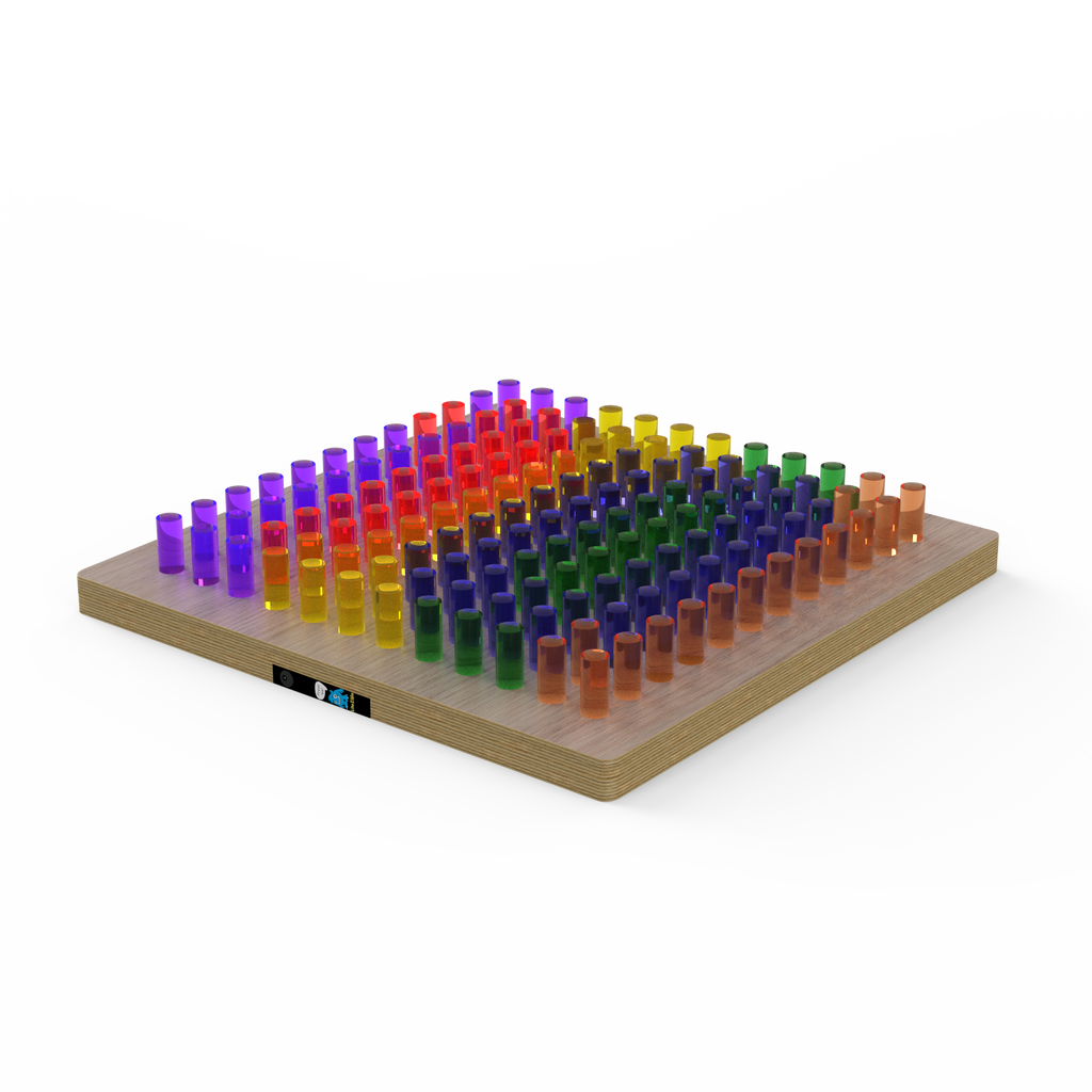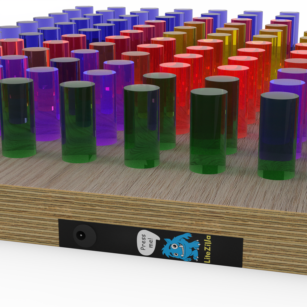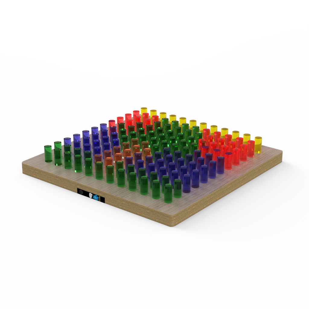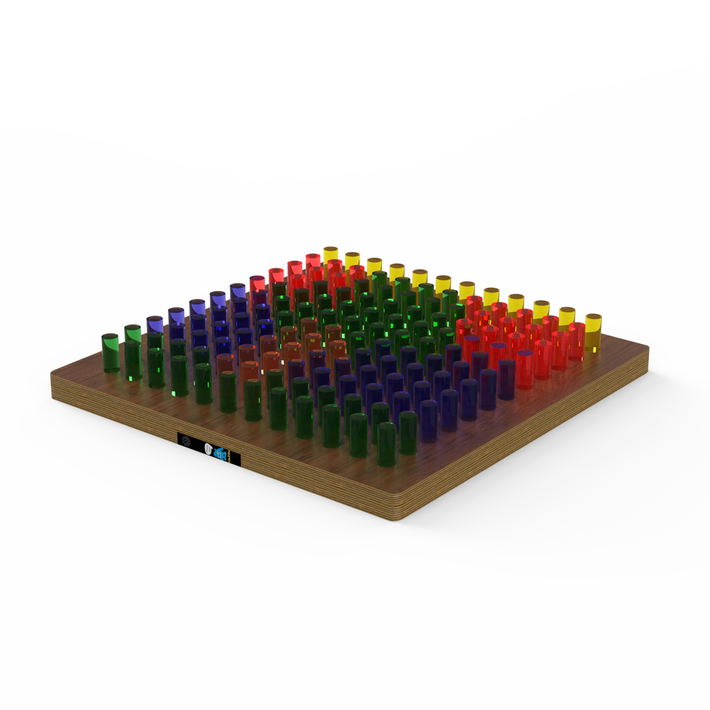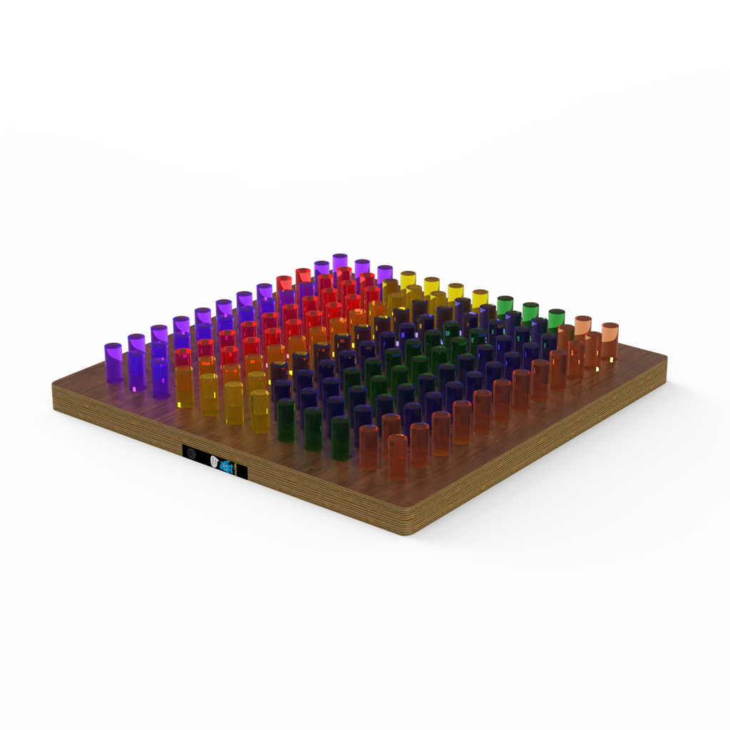 - Color Options: Frame: Blonde or walnut-stained hardwood; LitePins: 2.5″ long x 1″ diameter in Candy Red, Canary Yellow, Tangerine Orange, Emerald Green, Sea Blue, Violet Purple.