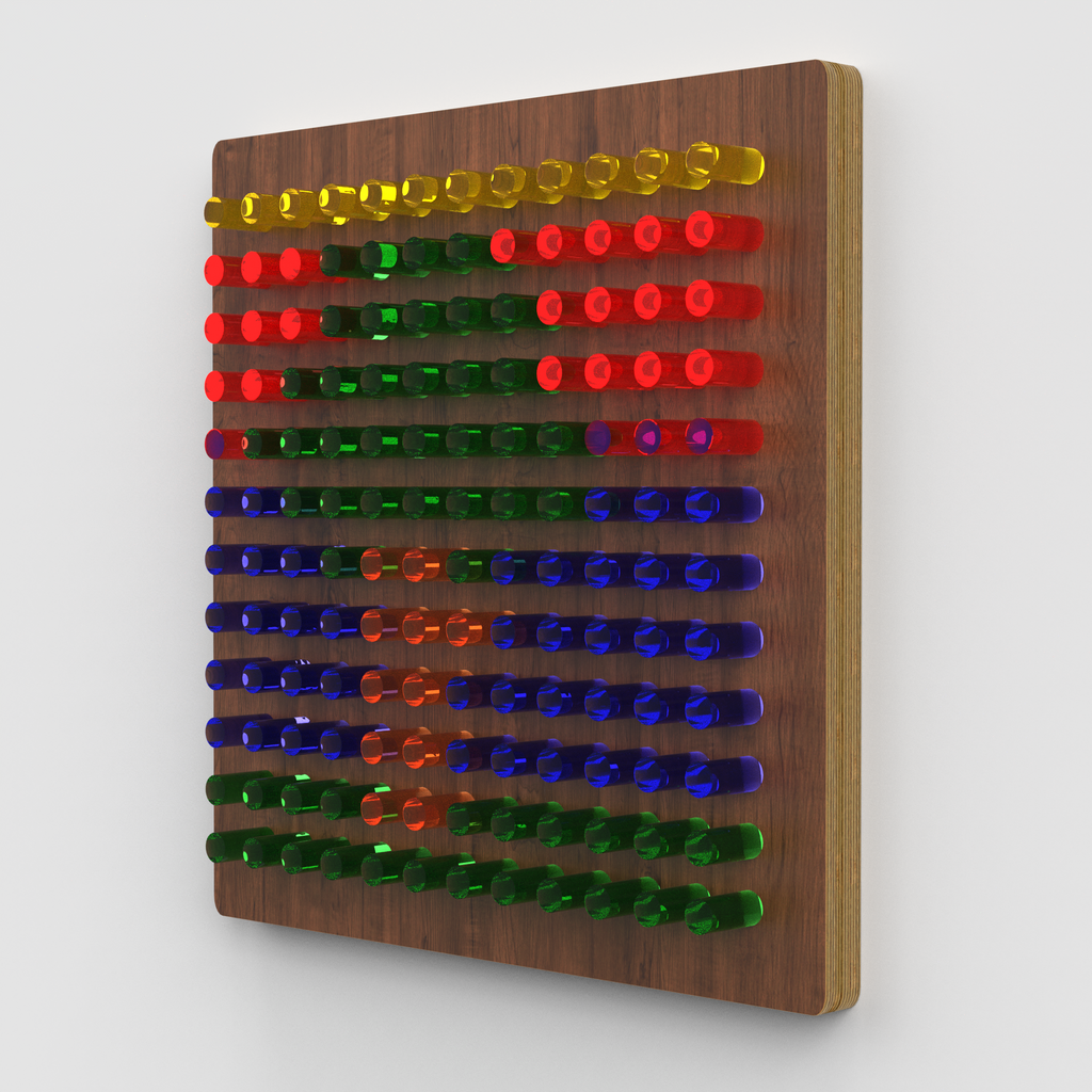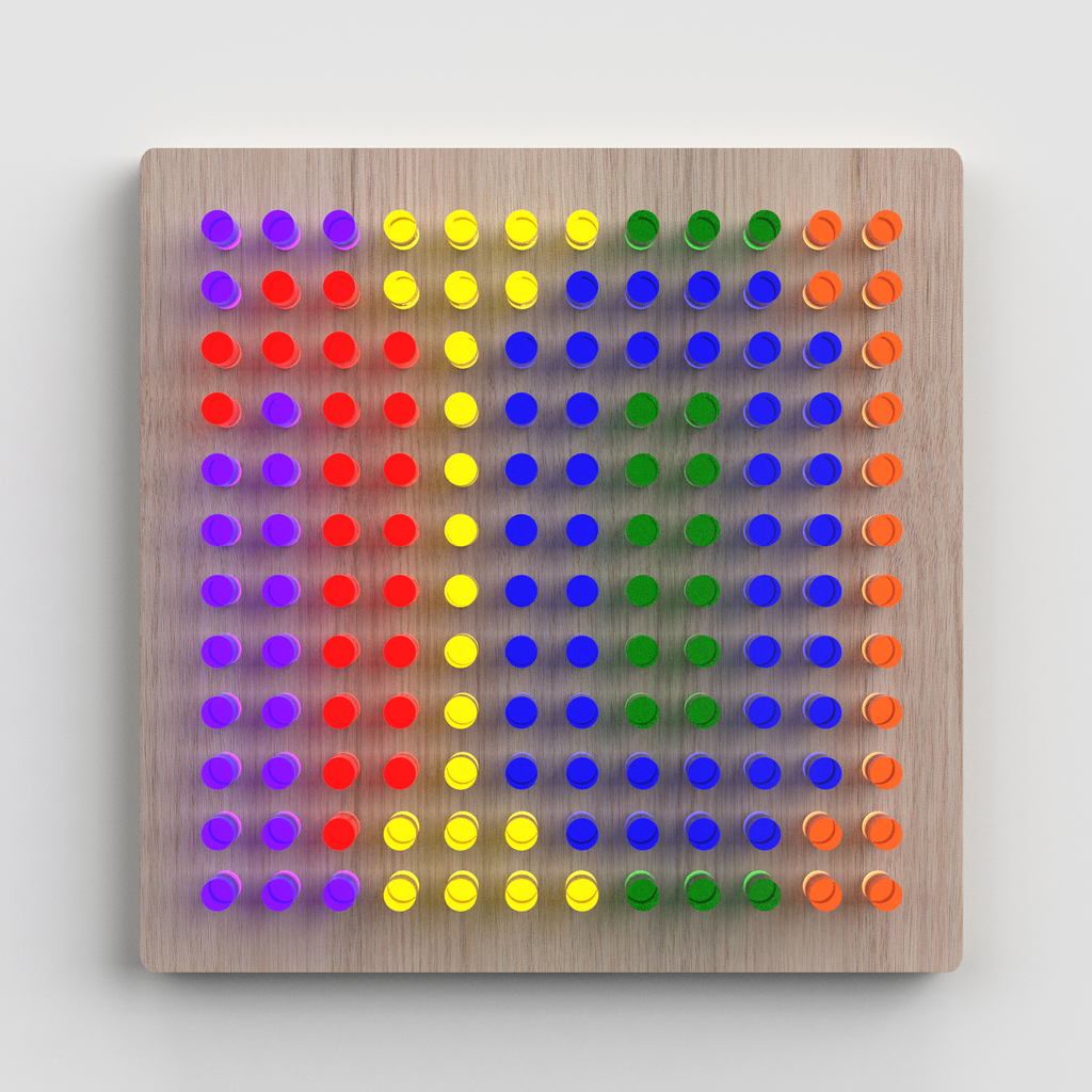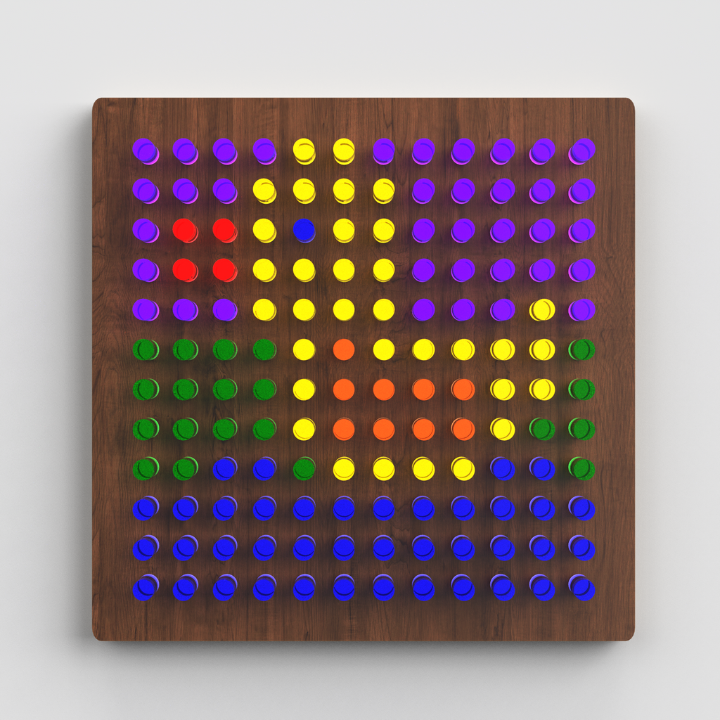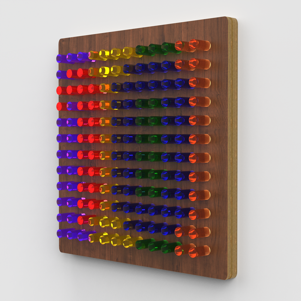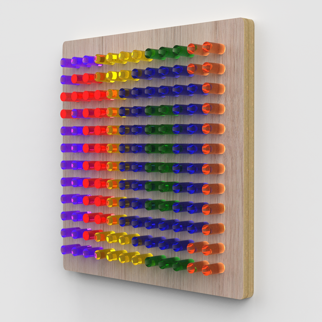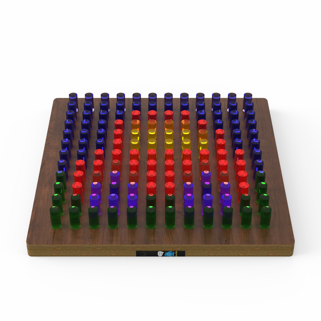 - Color Options: Frame: Blonde or walnut-stained hardwood; LitePins: 2.5″ long x 1″ diameter in Candy Red, Canary Yellow, Tangerine Orange, Emerald Green, Sea Blue, Violet Purple.