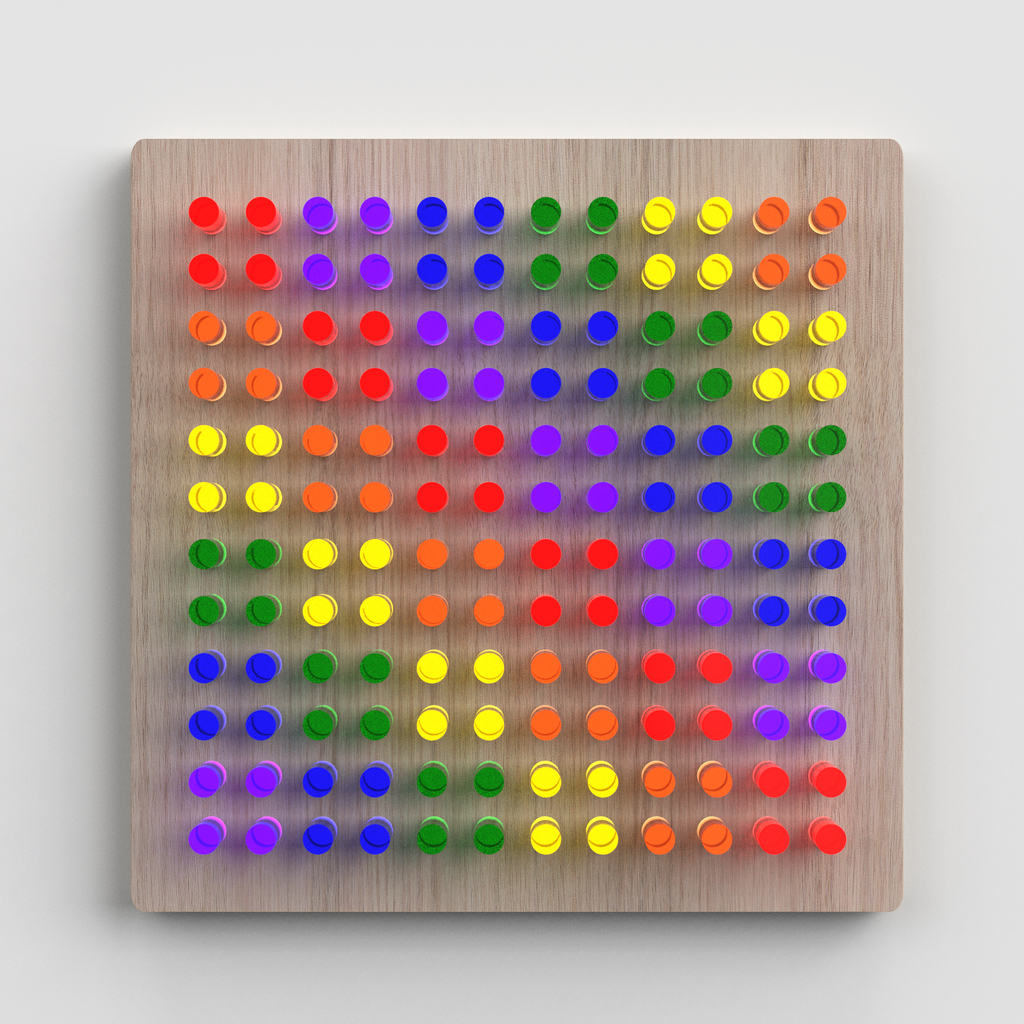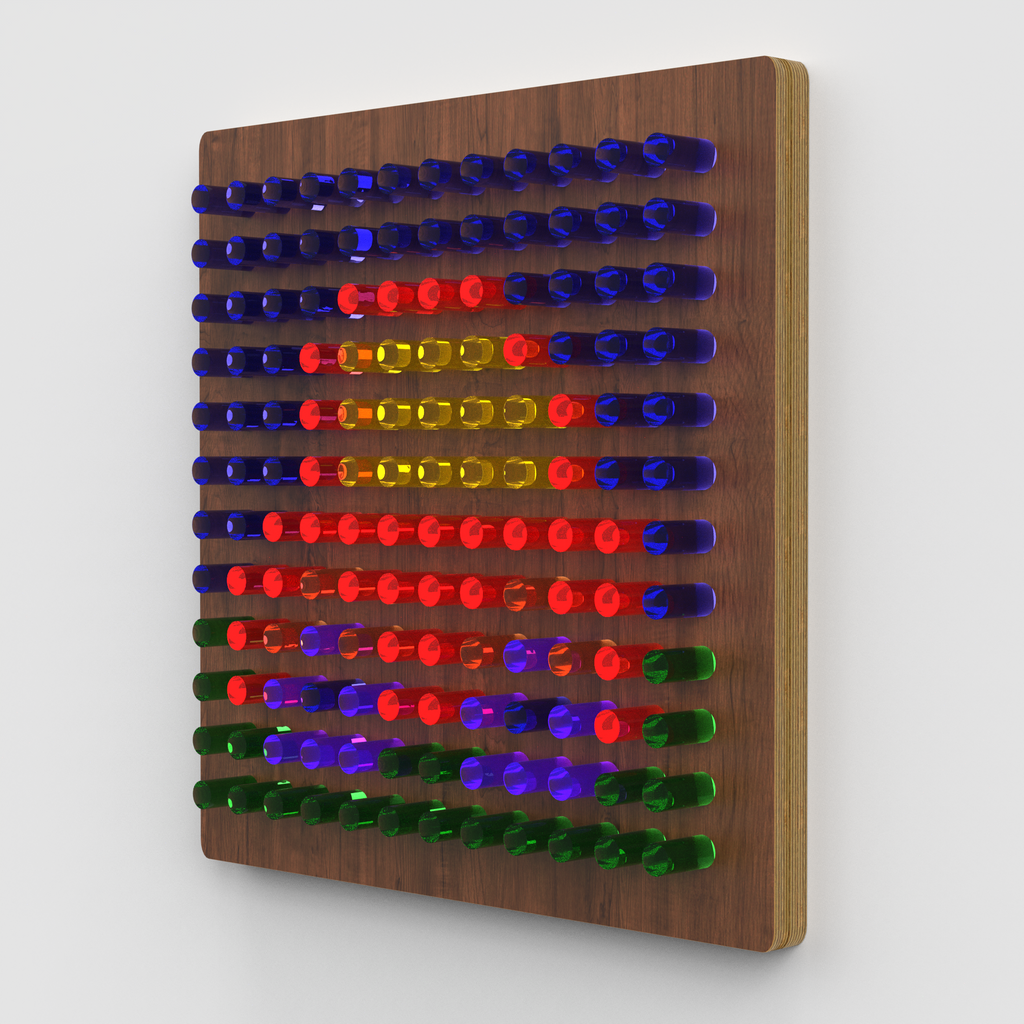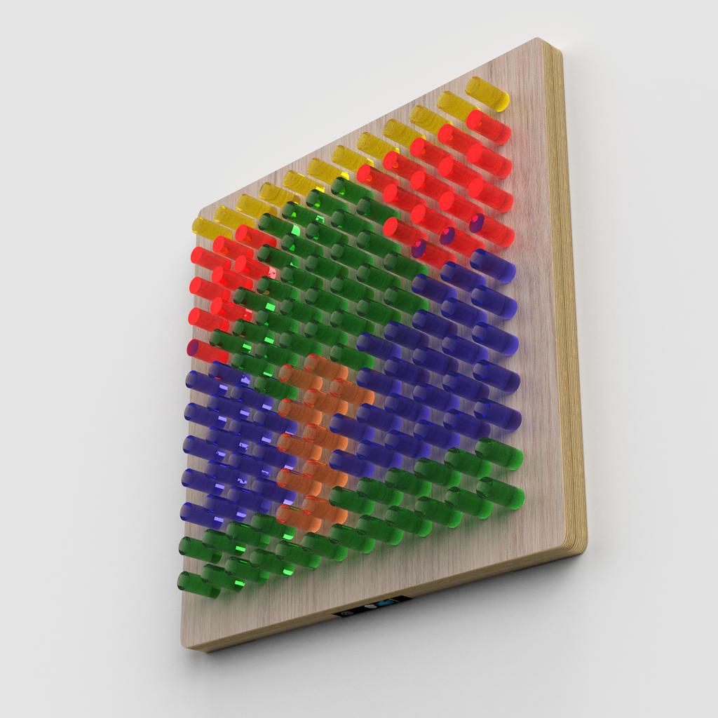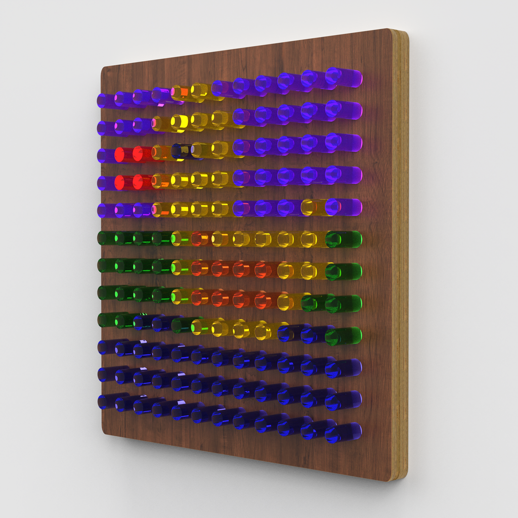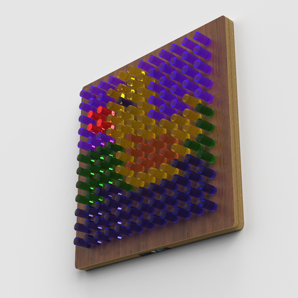 - Color Options: Frame: Blonde or walnut-stained hardwood; LitePins: 2.5″ long x 1″ diameter in Candy Red, Canary Yellow, Tangerine Orange, Emerald Green, Sea Blue, Violet Purple.