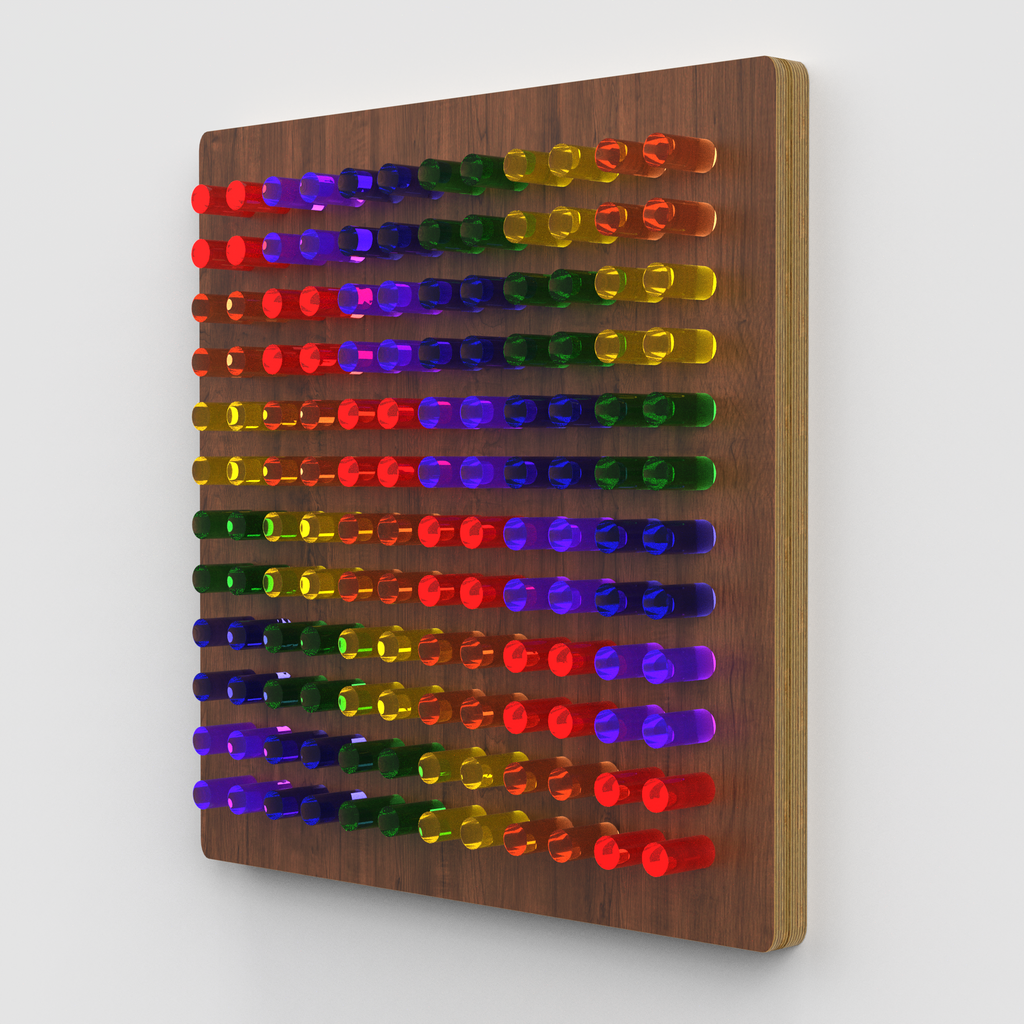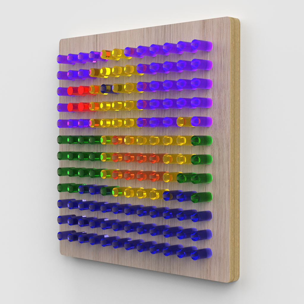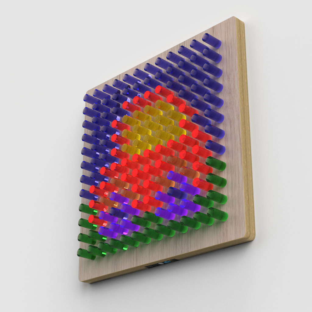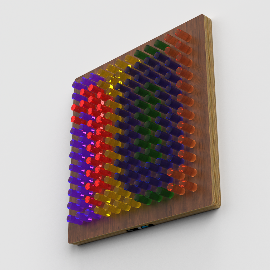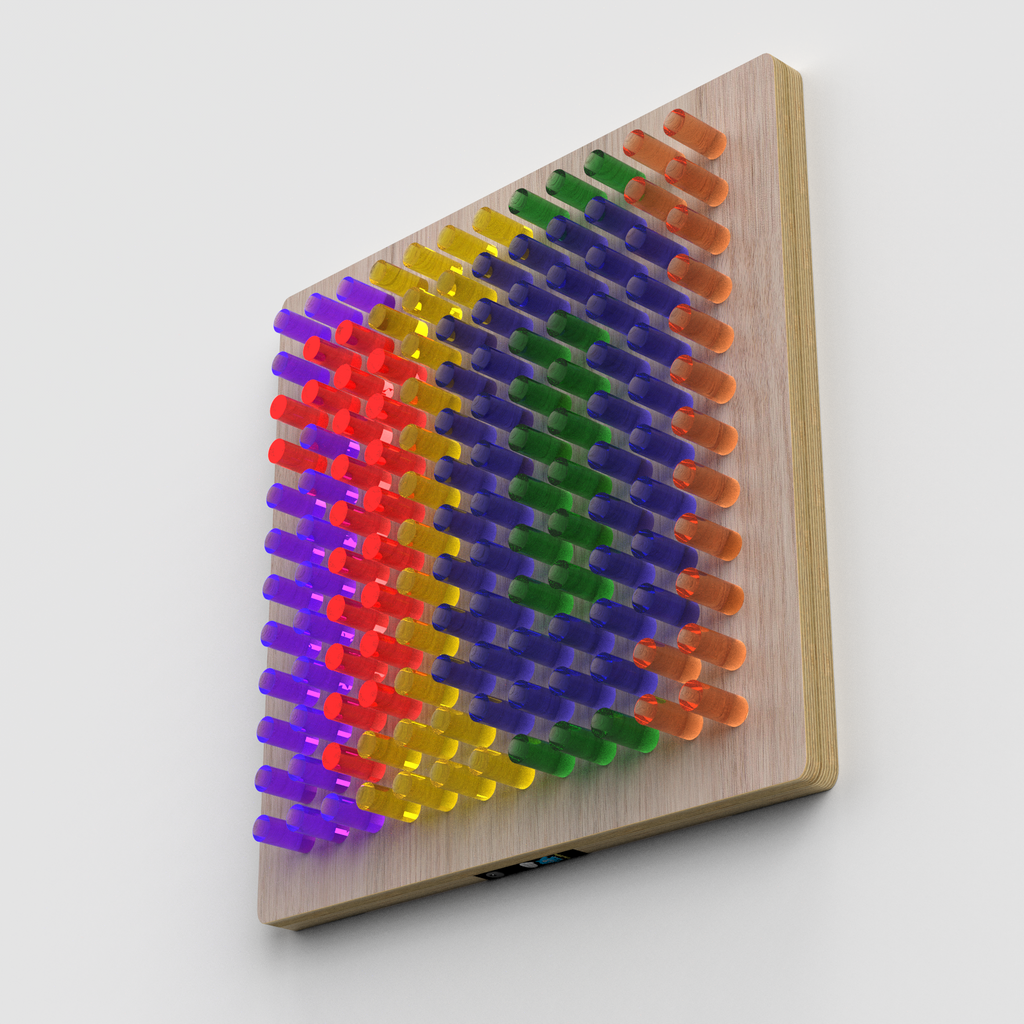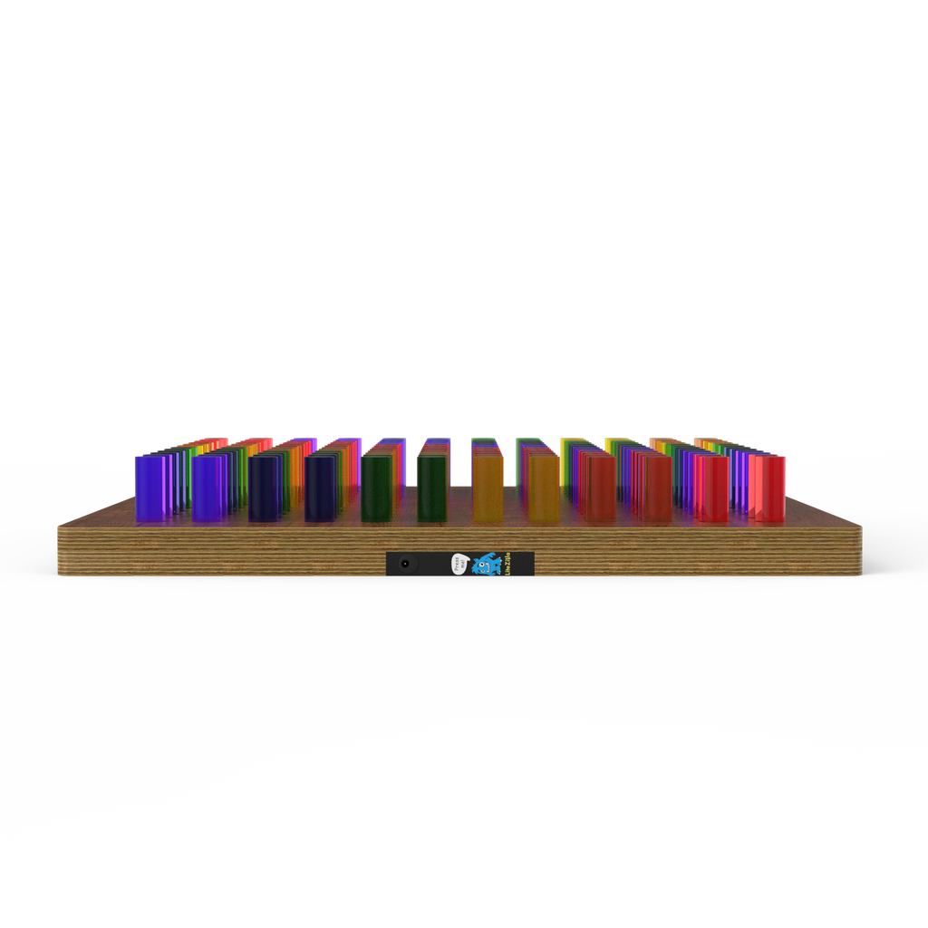 - Color Options: Frame: Blonde or walnut-stained hardwood; LitePins: 2.5″ long x 1″ diameter in Candy Red, Canary Yellow, Tangerine Orange, Emerald Green, Sea Blue, Violet Purple.