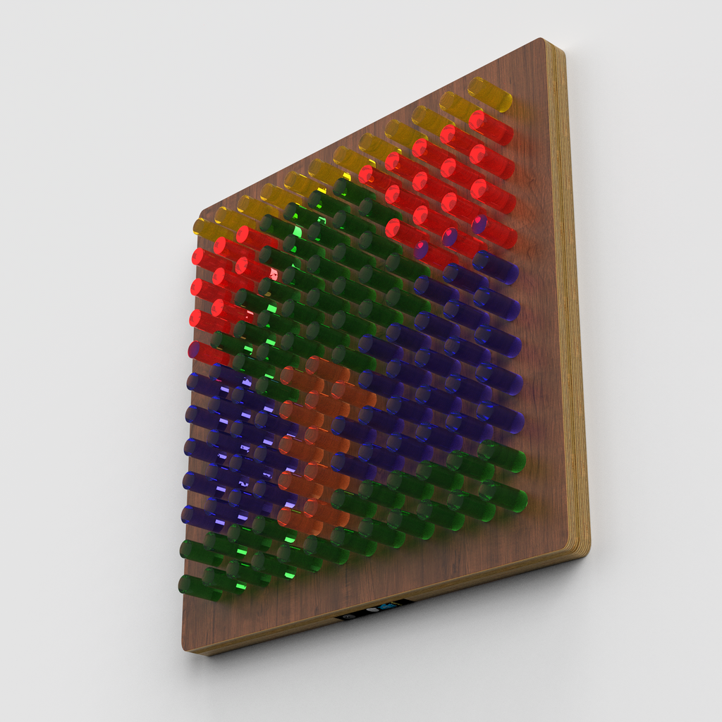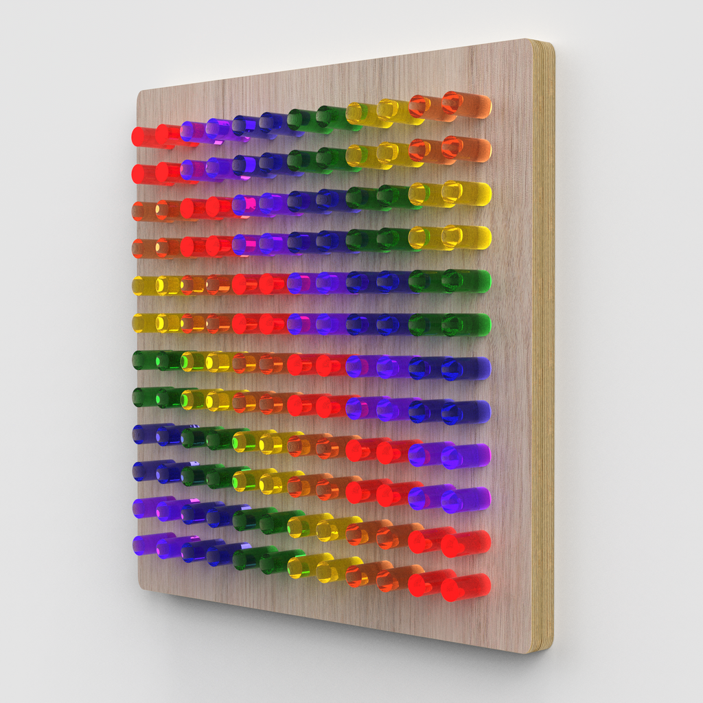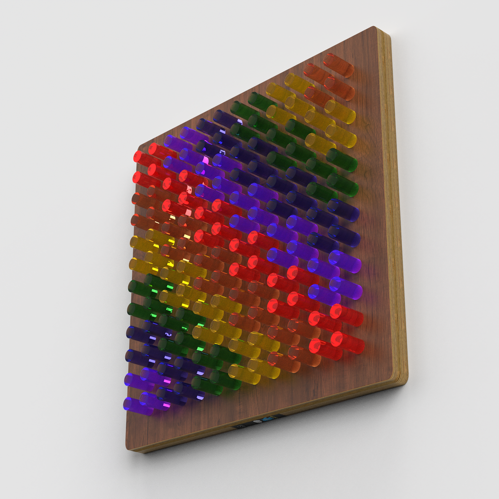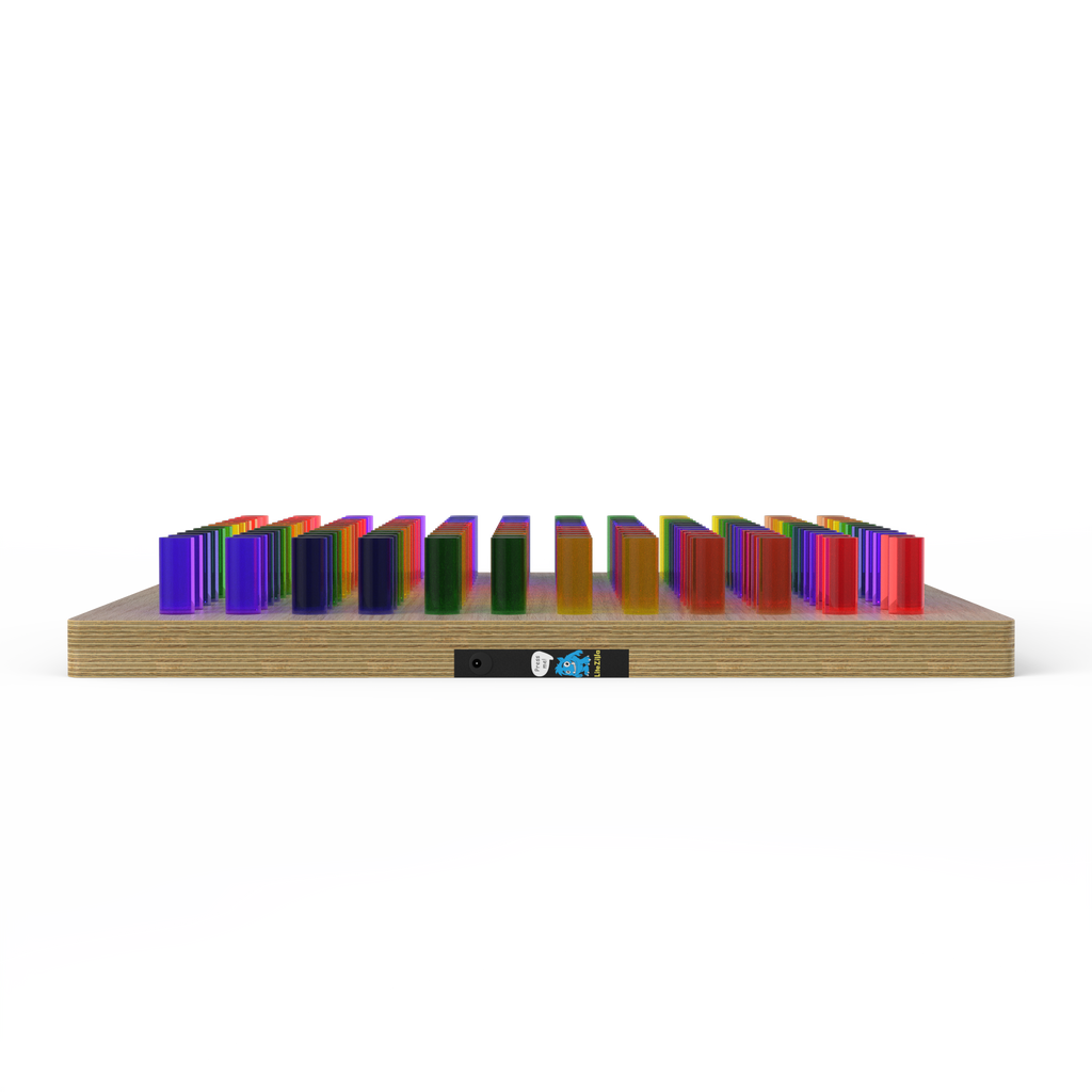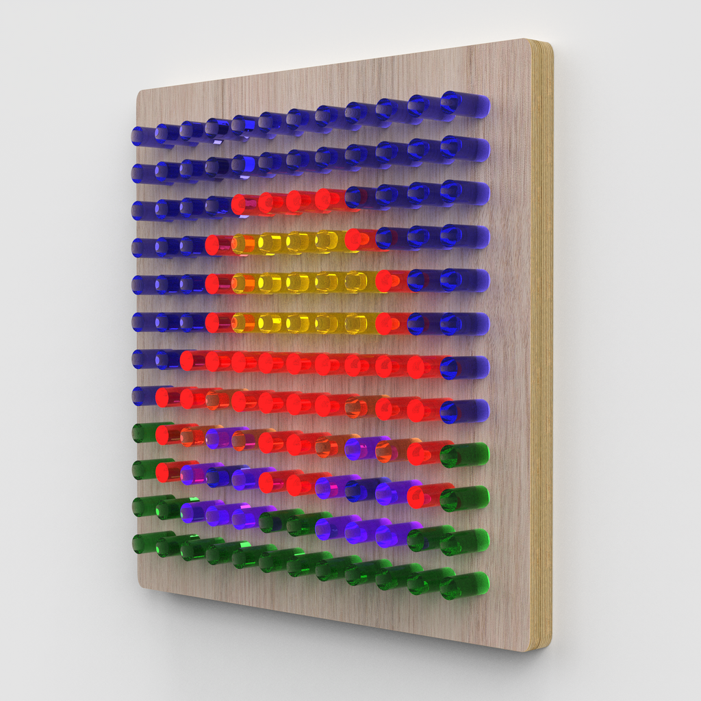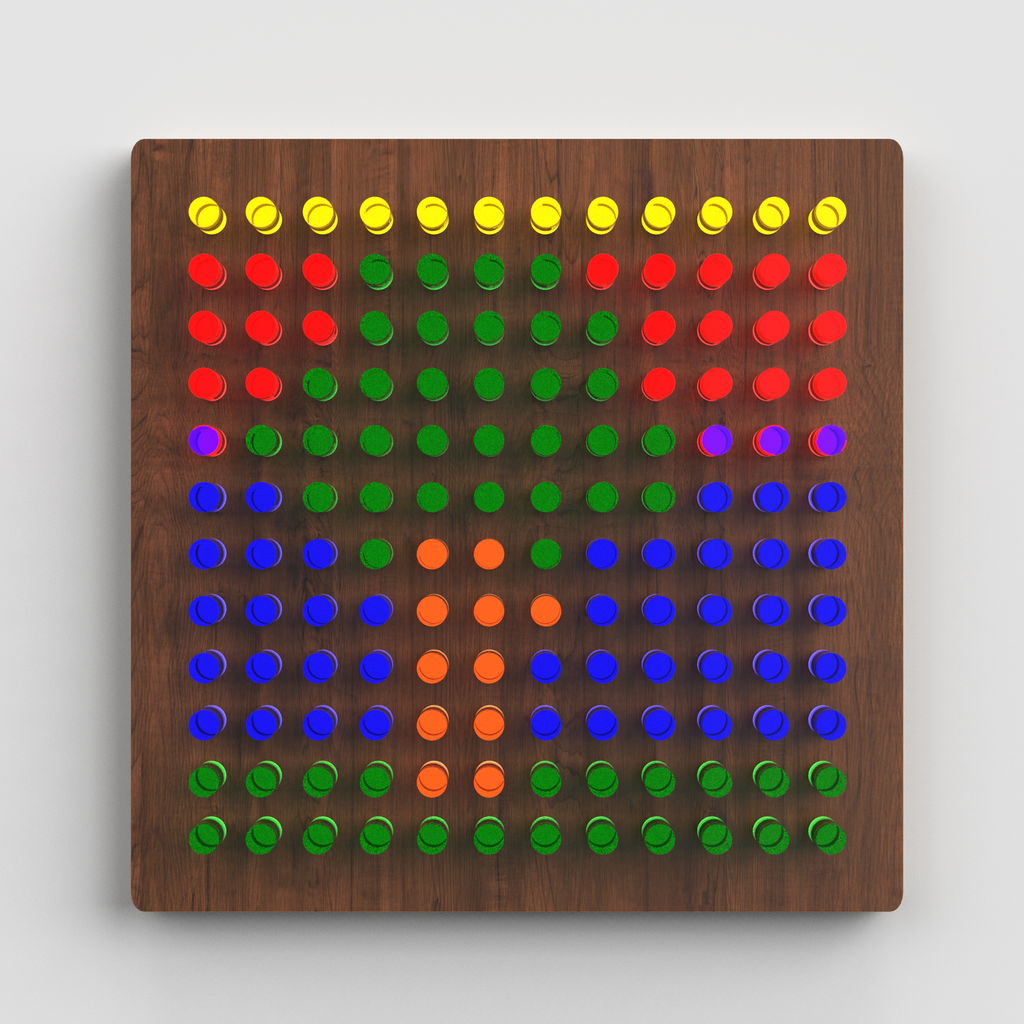 - Color Options: Frame: Blonde or walnut-stained hardwood; LitePins: 2.5″ long x 1″ diameter in Candy Red, Canary Yellow, Tangerine Orange, Emerald Green, Sea Blue, Violet Purple.