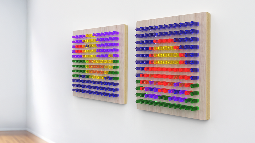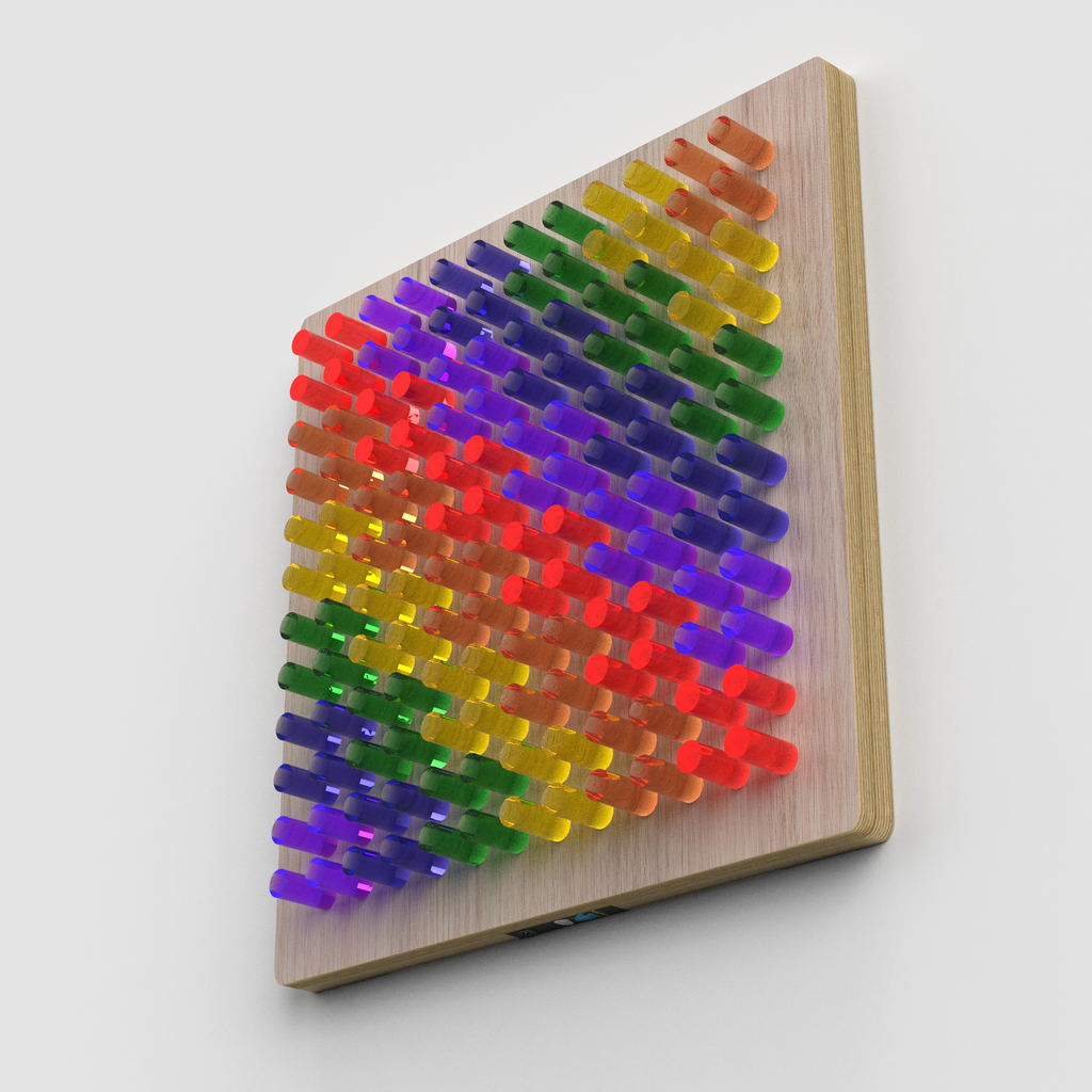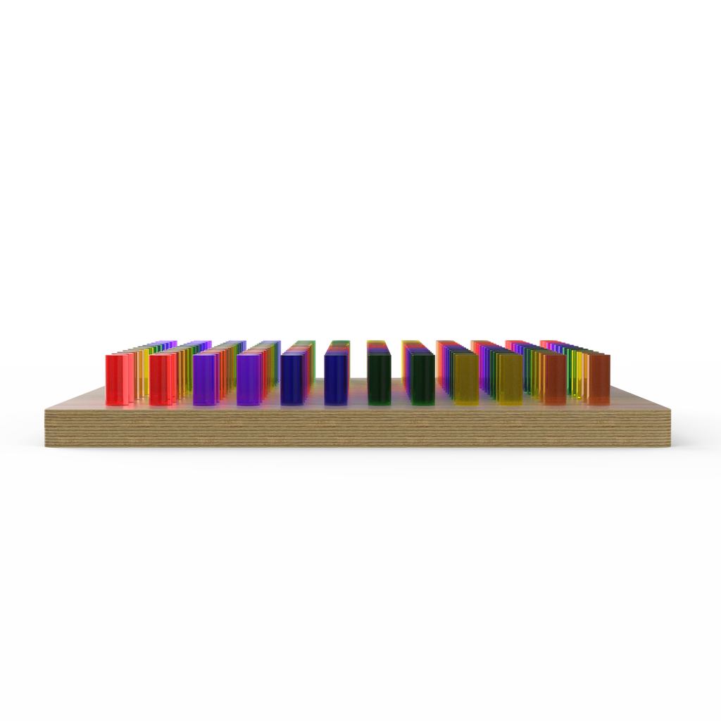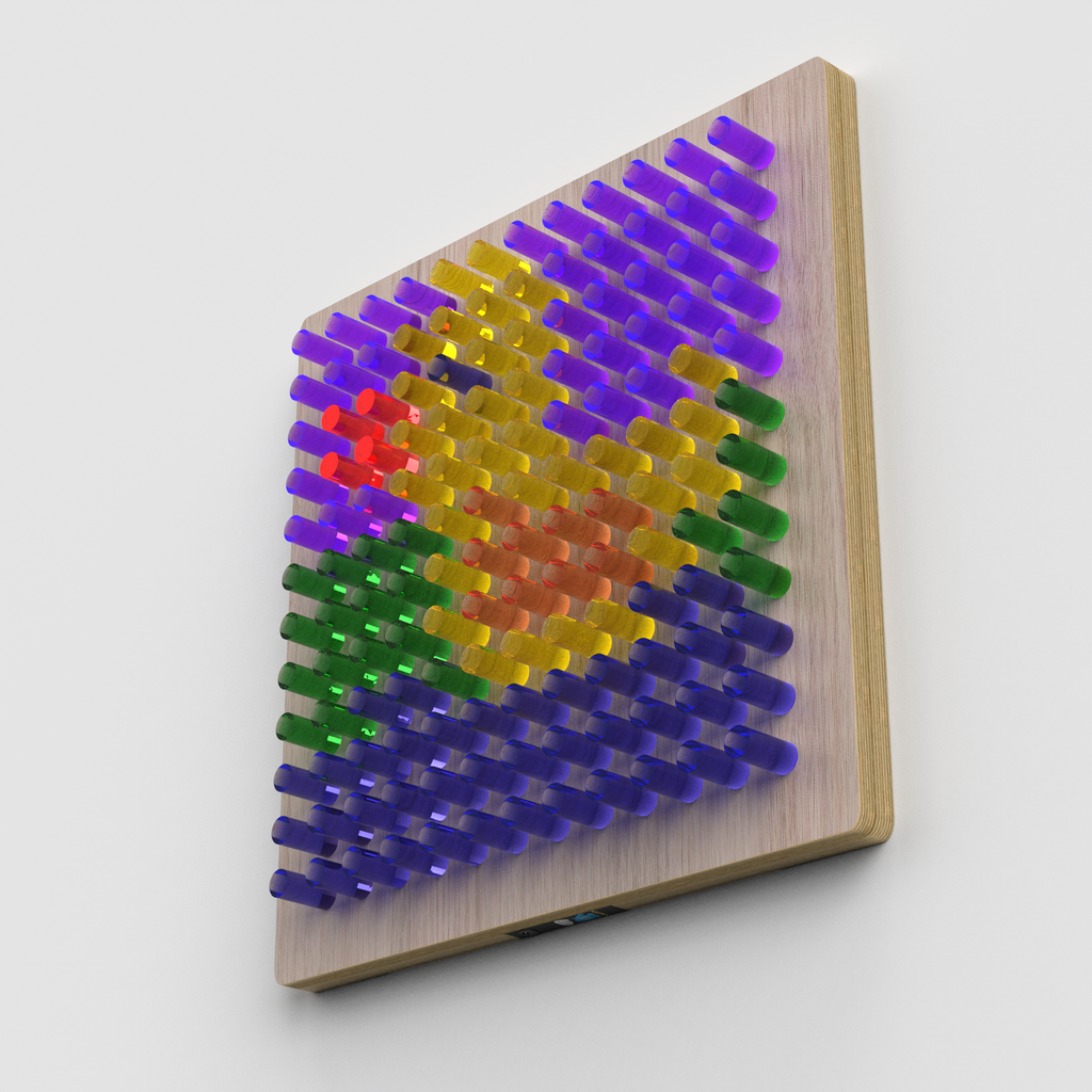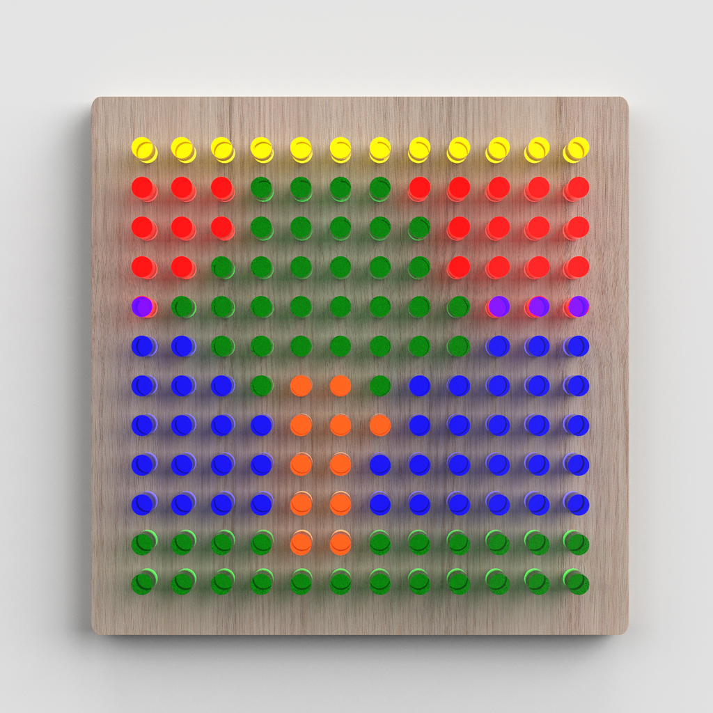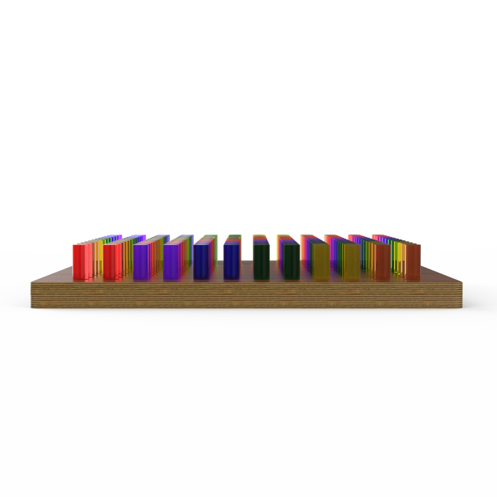- Color Options: Frame: Blonde or walnut-stained hardwood; LitePins: 2.5″ long x 1″ diameter in Candy Red, Canary Yellow, Tangerine Orange, Emerald Green, Sea Blue, Violet Purple.