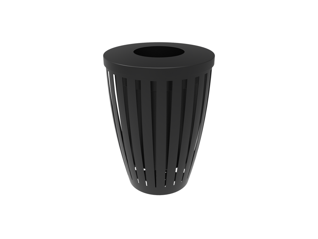 Revolutionize your waste management and elevate your outdoor spaces with the MyTCoat 32 Gallon Downtown Trash Receptacle with Flattop - Tapered - Slatted Steel (SKU RDW32)!