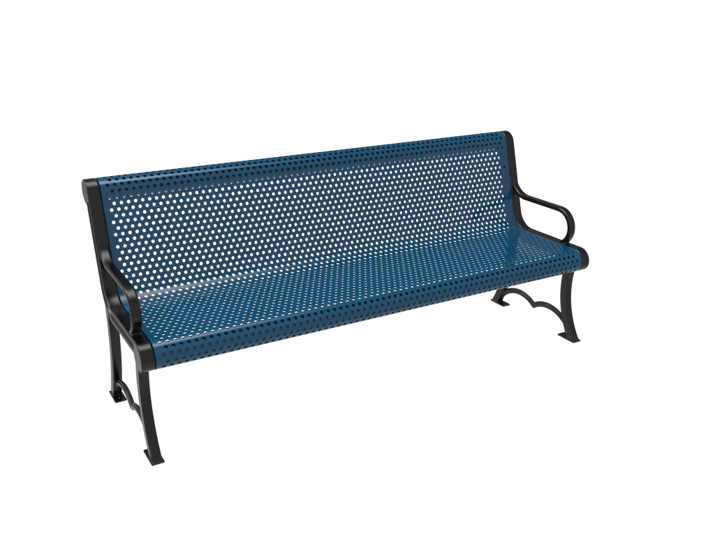 Elevate comfort, style, and community spirit with the MyTCoat 4' - 6' Austin Bench with Arm - Punched Steel - Cast Iron Frame - Portable/Surface Mount (SKU BAU04)!