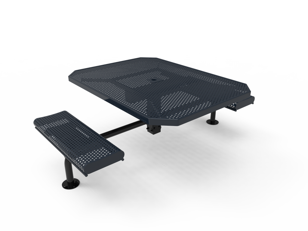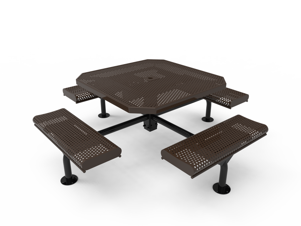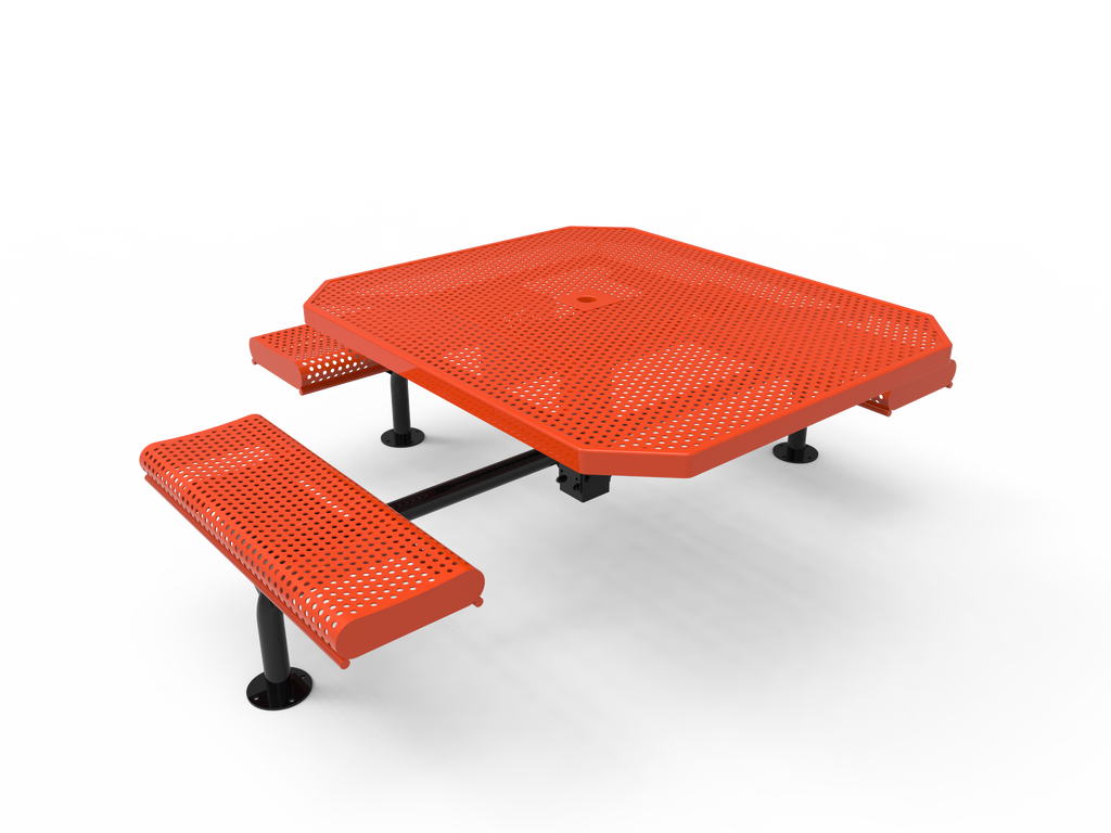 Elevate your outdoor spaces and foster vibrant community connections with the MyTCoat 46” Octagon Nexus Pedestal Table with Rolled Seats - Punched Steel - Surface Mount (SKU TOR46)!