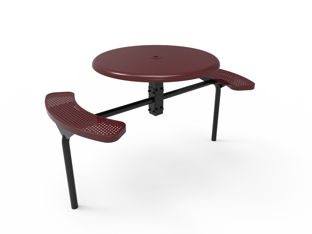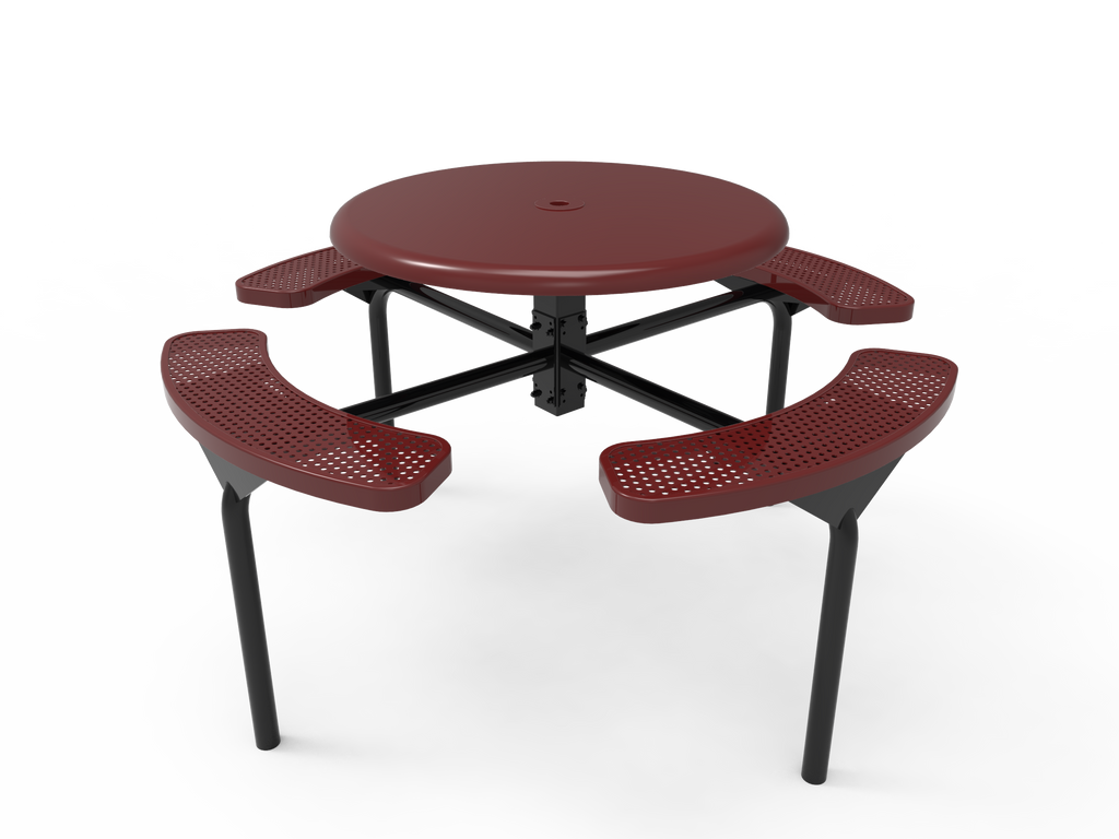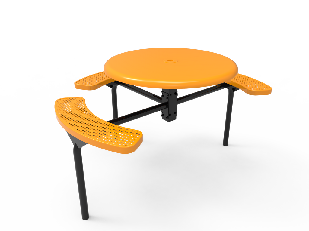 Elevate your outdoor spaces and foster vibrant community connections with the MyTCoat 46” Round Nexus Pedestal Table - Solid Top - Punched Steel - Inground Mount (SKU TRS46)!