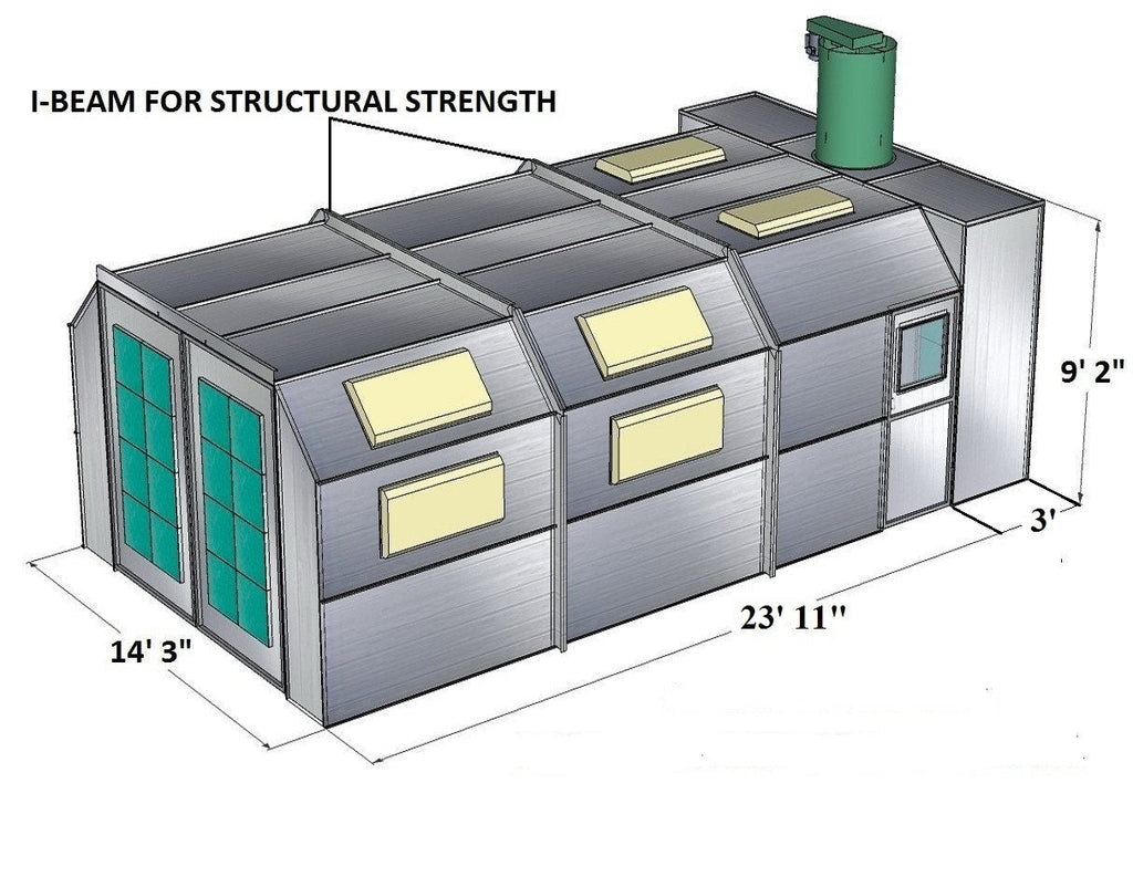 This (CF) booth is one step up from the Flat-Top; in that, it is 1’ wider, 1’ tall, 4’ deeper with horseshoe/bridge exhaust plenum. Thereby allowing more room for the painter/coater as well as providing a booth that can support a larger spectrum of vehicles due to the increased inside dimensions within a smaller footprint. American Made and Built in Reidsville, NC