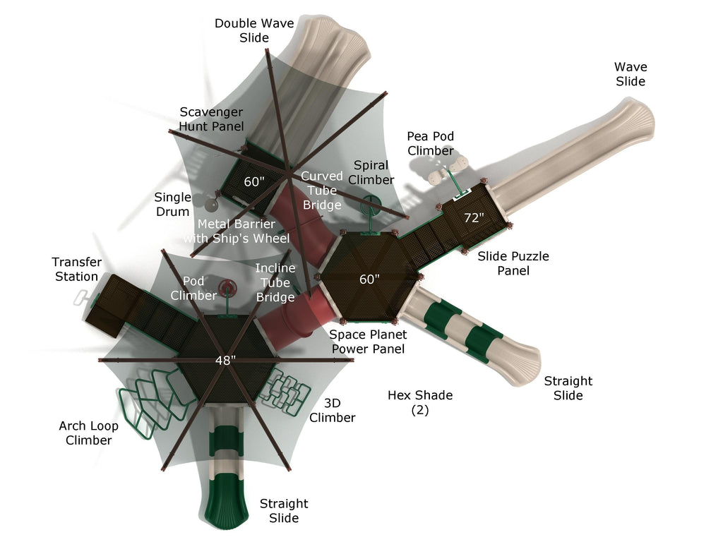 Includes: Spiral Climber, Pod Climber, Arch Loop Climber, Pea Pod Climber, Wave Slide, Straight Slides, Double Wave Slide, Hex Shades, and a Transfer Station