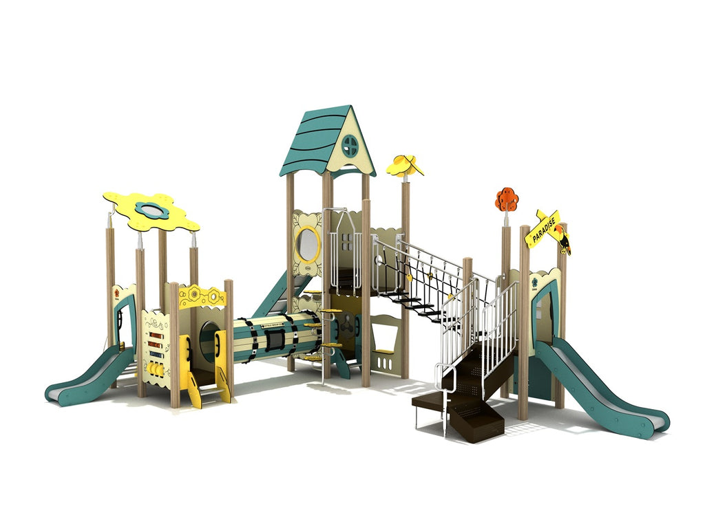 Includes: Multiple slides, bridge walkways, climbers, and interactive panels