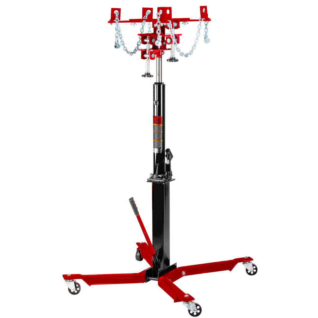 Pro-Lift Telescopic Transmission Floor Jack with 700 lbs capacity is designed to be used as an aid in the removal and installation of automotive and light truck transmissions, transfer cases, and transaxles. This telescopic style transmission jack is for use under an overhead lift or in a garage pit. The chrome-plated rams maximize their high reach operated by a user-friendly handle at your fingertip.