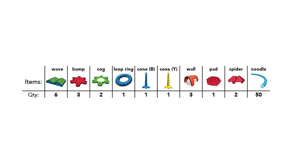 - Includes: 6 Waves, 3 Bumps, 2 Cogs, 1 Ring Loop, 1 Yellow Cone, 1 Blue Cone, 3 Orange Walls, 1 Pad, 2 Spiders, 50 Noodles (compatible with pool noodles).