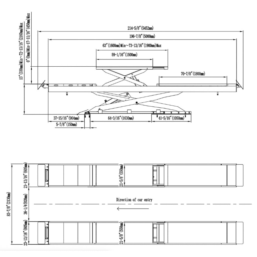 Built for unmatched versatility, it offers both On-Ground surface mount and In-Ground flush mount options. Equipped with dual bridge jacks and turntable plates, and featuring a pneumatic safety lock release, this lift has an impressive 210 5/18" long platform, perfect for even the longest vehicles. Effortless to operate and maintain, our scissor lift supports up to 11,000 lbs., making it perfect for inspections, repairs, and maintenance on any vehicle.