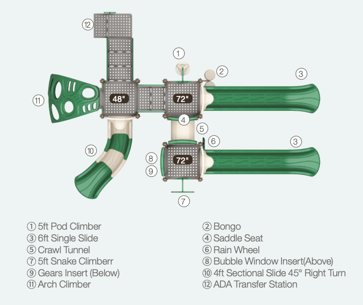 - Key Play Components: Three elevated decks, pod climber, vertical ladder, angular bone bridge climber, two straight slides, wide-turning curve slide, gear panel (ground level sensory play).