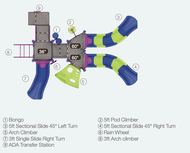 - Key Play Components: Curved climbers, elevated decks, crawl spaces, activity panels, climbing wall, pod steps.