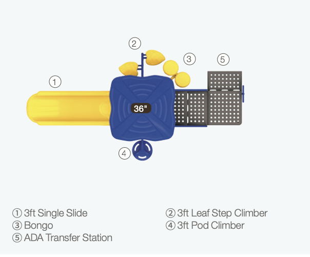 - Key Play Components: Straight slide, drum panel, vine-style climber, accessible stairs, partially shaded elevated deck, ADA transfer station.